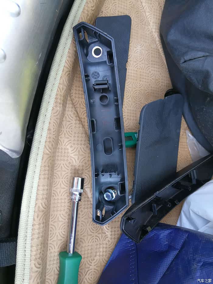 后备箱内拉手也要撬开,里面是2颗6角螺栓,使用M10的套筒拆除