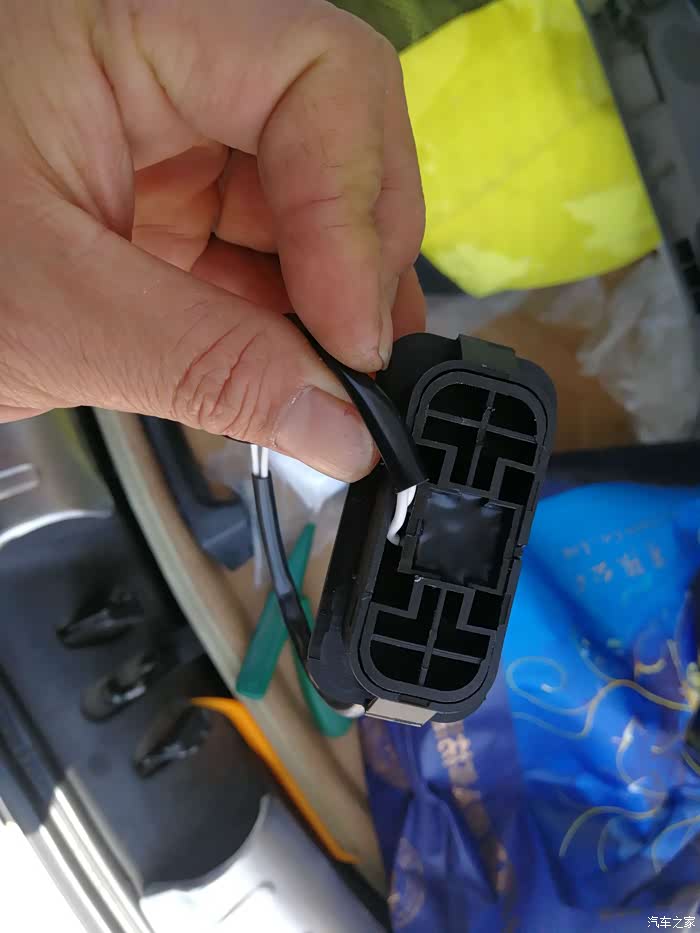 有后雨刮电机遮挡住,新开关从外面安装,先穿入线头。困难的地方是开关电线中间固定的胶块。