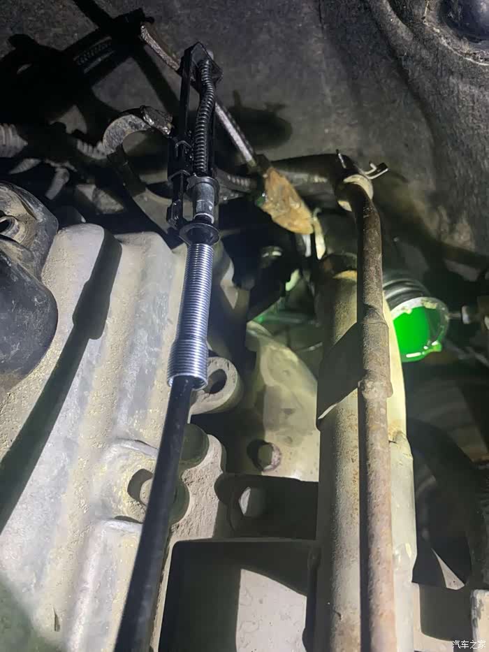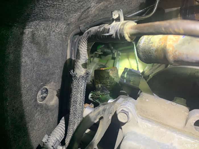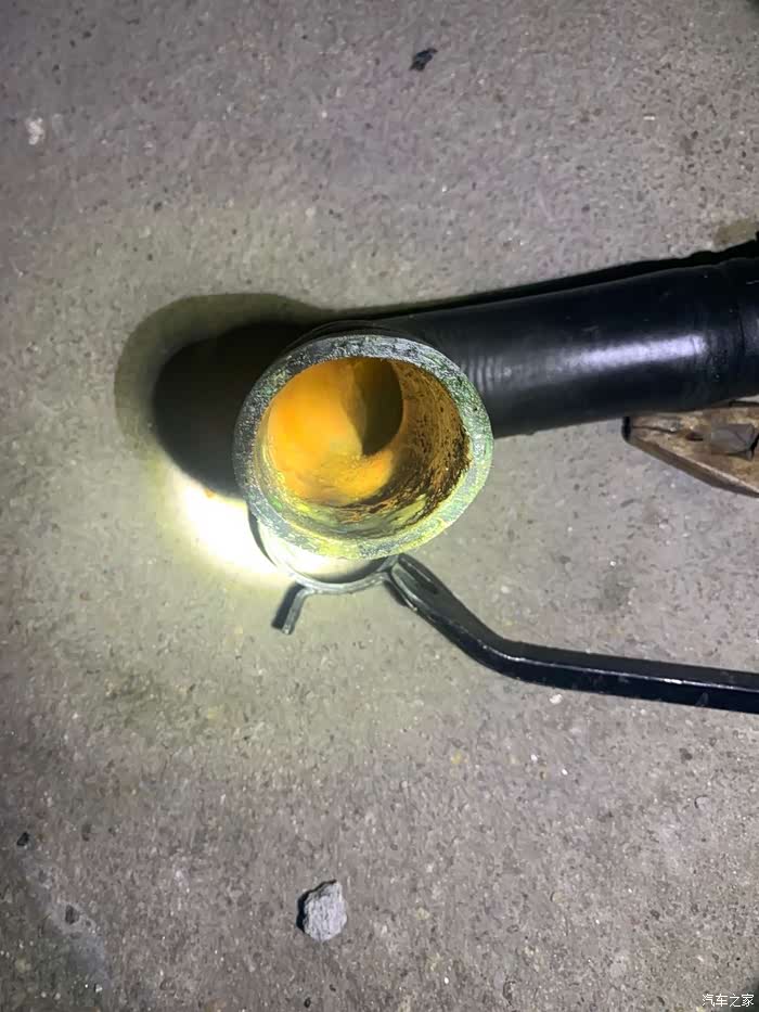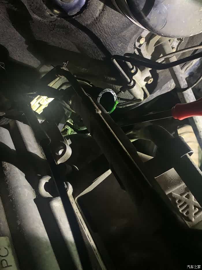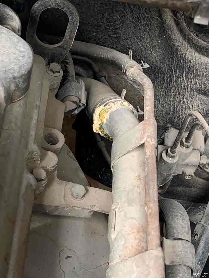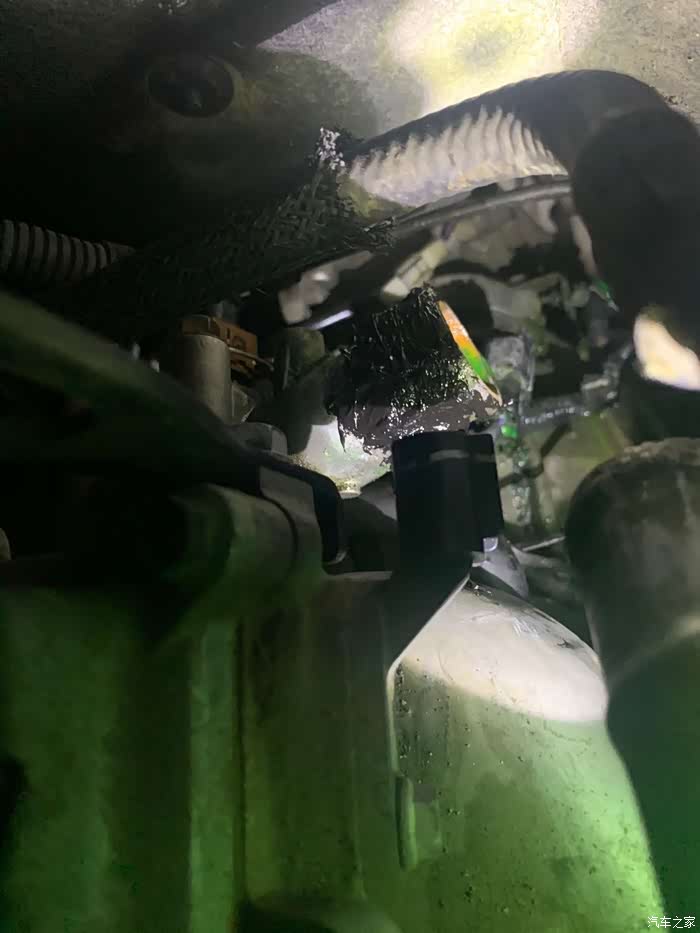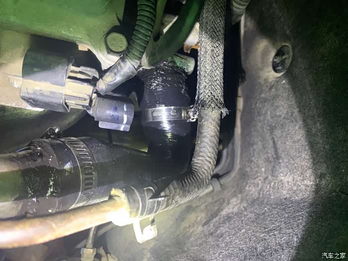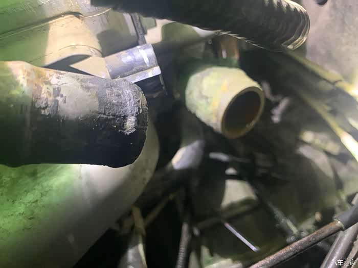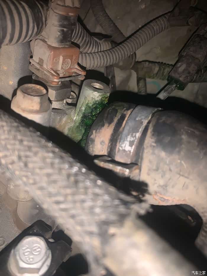 此图可以看到水管的位置非常隐秘,很难发现。我也是看到管子接口出,有绿色的固体覆盖在那里才发现的。因为我加的水箱宝是绿色的液体。