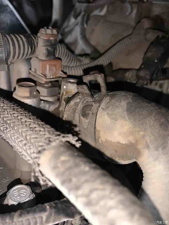 已经服役了快6年了。问题多多少少遇见了,但是都不是大问题,该修的修,该换的换,还是一台拉货载人的好车。发现发动机出水管问题去送货路上发现水箱温度指示亮了,就知道肯定是没有冷却液了,因为很久没有去看冷却液的多少了。赶紧找个合适的地方停车,开盖检查。一看冷却液的壶里什么都没有了。绿色的冷却液已经到底了。现在买也来不及,只有车上有两瓶矿泉水,赶紧加进去救急吧~!后来回去以后检查才发现原来是发动机的进水管有冷却液漏了。开始看图吧~!