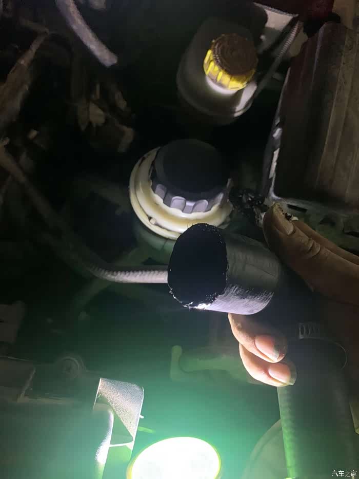 水箱壶子里的冷却液加进去新的,隔几天又会漏掉些。看来必须做手术了。由于白天需要用车,只有晚上进行操作,这样白天就可以继续工作了。
