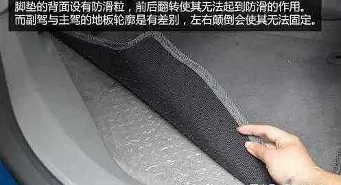 有部分款式的脚垫正反面十分相似,车主要仔细辨认清楚。脚垫的正反面颠倒不但不能起到防尘防滑的作用,而且还无法牢固固定,甚至还会与踏板发生干涉。前后颠倒铺设也都是禁止的。