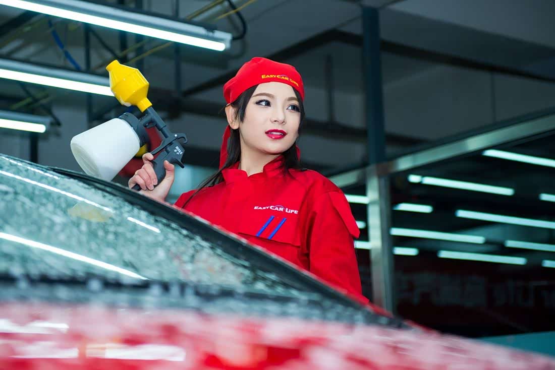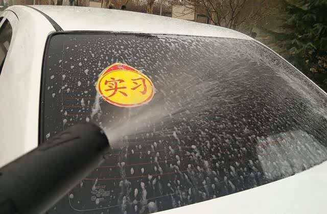 将适量的洗车精倒入皂液壶内,加入水溶解,再将皂液壶安装于水枪上,喷洒于车身的每个位置,再用海绵擦去顽固的泥渍,让爱车来个泡泡浴哈。