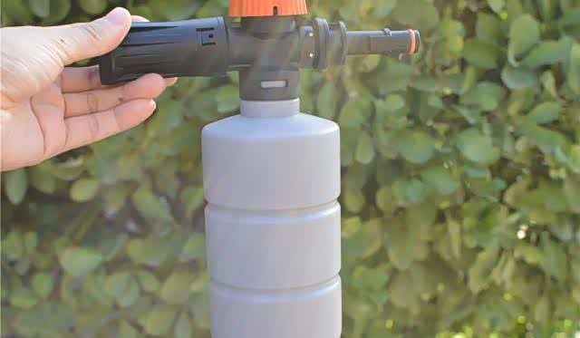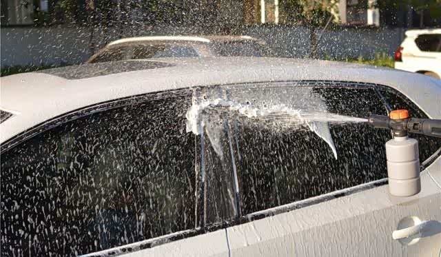 把洗车液和水装入泡沫喷壶中,然后喷射到车上。