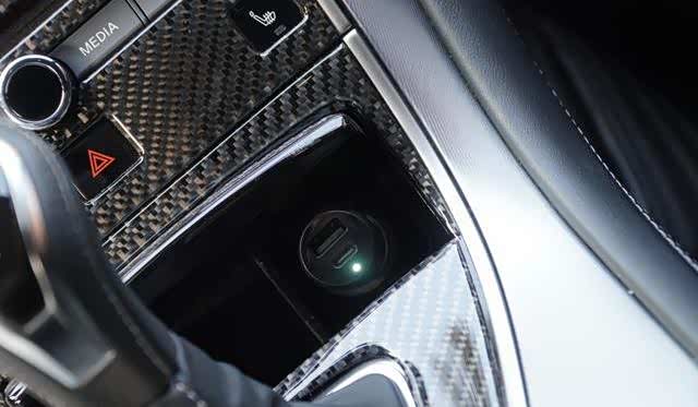 最底部是一个正极顶针,侧边是两个负极的弹片,表面做了防锈处理。只需对准位置,用力将它插入车载点烟口之内,就能很方便的开始使用了。车充的供电接口面微微向内凹陷,没有像侧面一样采用哑光设计,提供了一个USB-A口、一个USB-C口。在接口的上方有一枚连接指示灯,在正确连接开始供电之后指示灯便会点亮。
