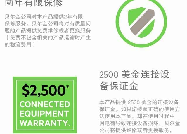 贝尔金也为各类充电设备投下了CEW安全连接保险;两年保修和2500刀的设备保证金,也是有着足够的信心和基础才敢这么承诺。