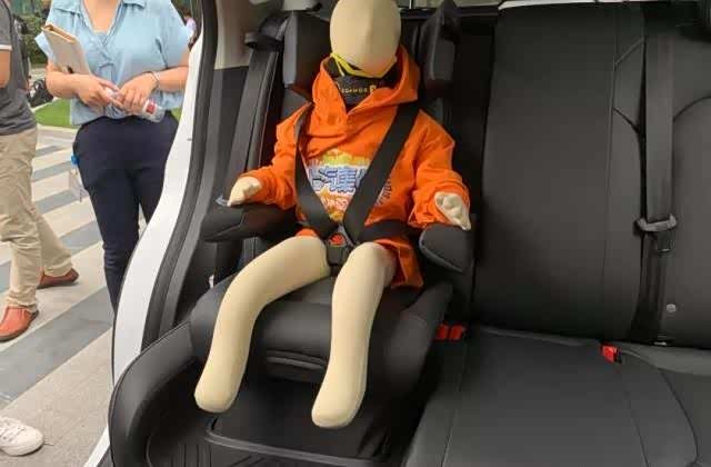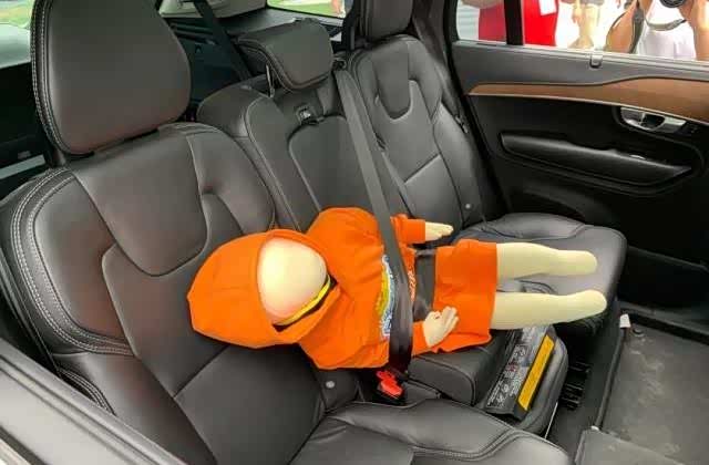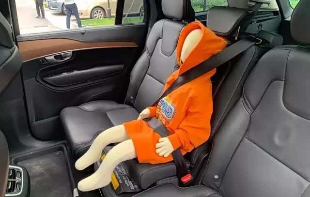 第一位出场的是沃尔沃XC90,它的安装使用是三位选手中最简单的,只要把第二排中间的坐垫抬起,提升乘坐高度,让小孩也能用到安全带。不过,它的不足是最明显的,两侧没有其他固定装置,只能用常规的三点式安全带,年龄较小的儿童还是不能用的,在行驶的过程中有可能出现安全隐患,如安全带勒脖子、左右倾倒(坐不稳)等问题。