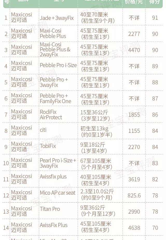 Maxicosi迈可适有3款产品的得分在90分以上,是适合0至1岁婴儿使用的安全提篮,使用Isofix系统和反向安装。