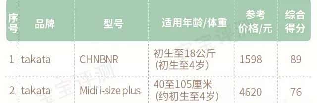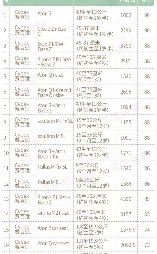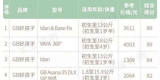 备注:各个机构的综合评分形式并不一致,主要有5分制、百分制、星级制等形式,为了进行统一的比较,笨爸爸将综合评分形式统一转换为百分制。价格来源于各个机构测试公布的价格,仅供参考,请以实际销售价格为准。以下各表相同。在多次测试中,好孩子的4款产品得分都在80分以上,一款是配备了独立底座的GB好孩子Idan Base-fix,一款是未配备独立底座的GB好孩子Idan,一款是可以双向安装的GB好孩子VAYA 360°,还有一款提篮+座椅的GB Asana 35 DLX。更值得推荐的是GB好孩子VAYA 360°和GB好孩子Idan Base-fix(独立底座)。