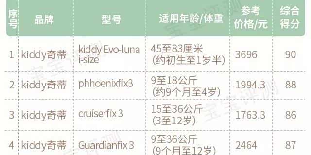 Kiddy奇蒂的4款产品综合得分在80分以上,Kiddy奇蒂常年在德国《测试》和德国汽车俱乐部ADAC的测试中获得最佳评价。其中,表现最好的是kiddy奇蒂Evo-luna i-size。这款产品是德国商品检测基金会2017年测试的最优款,是一款适合初生宝宝使用的安全提篮,价格也较贵。