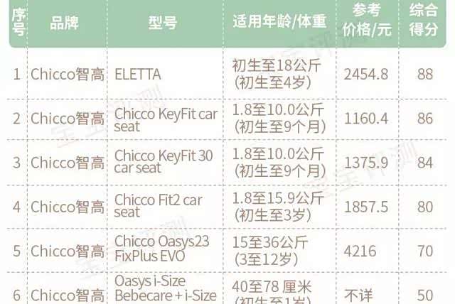 Chicco智高有3款产品均在80分以上。最值得推荐的两款产品是Chicco智高ELETTA和Chicco智高KeyFit car seat。Chicco智高Oasys i-Size Bebecare + i-Size Base则在2019年5月的正面碰撞测试中失败,碰撞时,安全带扣和胯带从座椅里撕裂开,宝宝会被甩出座椅,造成严重伤害。这款产品目前已被智高下架。