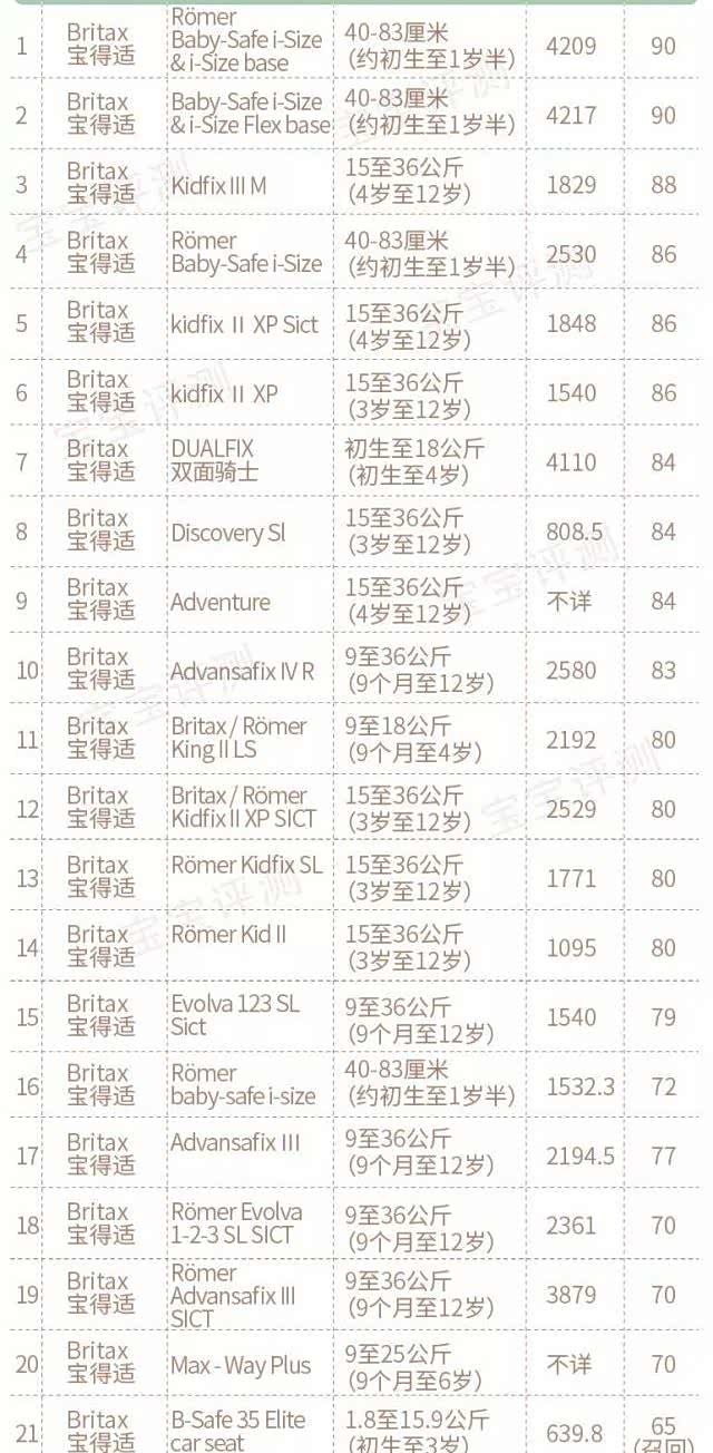 另外需要特别注意的是,Britax宝得适的两款产品,Britax宝得适B-Safe 35 car seat和Britax宝得适 B-Safe 35 Elite car seat虽然评分为65分,但建议消费者谨慎购买。