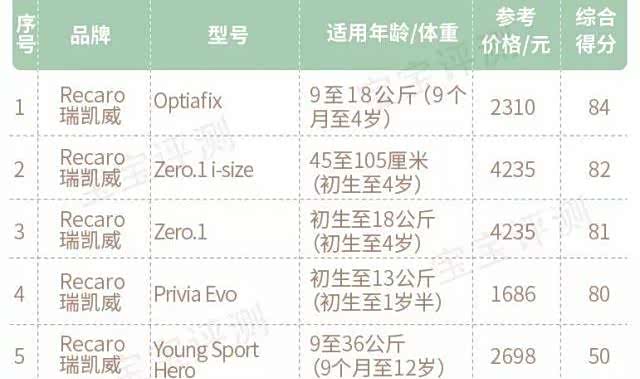 Recaro瑞凯威有4款产品得分在80分以上。其中表现较好的是Recaro瑞凯威Optiafix,各项指标表现优良,性价比高,配有Isofix系统。