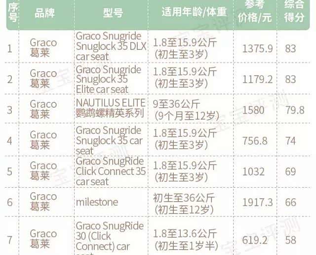 Graco葛莱有两款得分在80分以上,适合0至3岁宝宝使用,各项指标表现良好,性价比高,采用LATCH连接器。