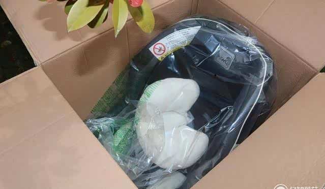 打开包装箱,入眼的是厚实的尼龙袋包裹着黑色的安全座椅。在此说明一下,Kiwy 儿童安全座椅种类丰富,系列众多,比如狮子王、查理王、西西里、米兰之星、哈雷骑士等等知名度都很高,而且不同年龄、不同性别均有针对性。笔者所获得的这款是哈雷卫士SE01。