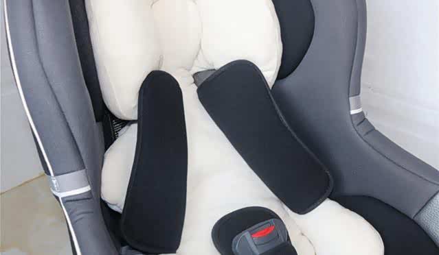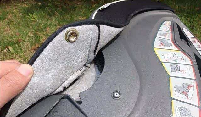 特别提醒,当婴儿的体重低于5KG时,一定要使用内衬垫,而且要保证安全带的位置固定在最低一档的孔位;当孩子体重超过5KG,要将内衬垫取出。