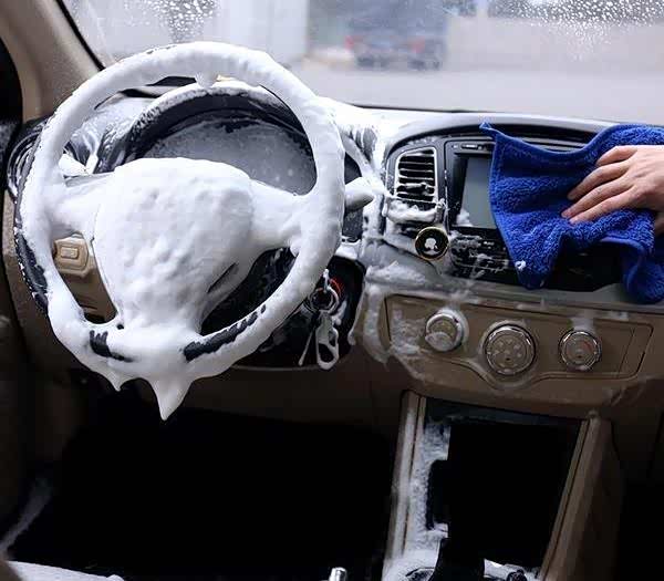 先使用车载吸尘器将车内灰尘全部清除干净,然后再使用专业的泡沫清洁剂清洗汽车内饰,让汽车内饰焕发光彩。但需要注意的是,这时候清洗汽车内饰的毛巾最好不要选用纤细纤维的毛巾或者抹布,避免刮花汽车内饰。
