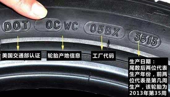 车辆轮胎生产日期,也是在胎面DOT后面,共有4个数字,比如3513,表示该轮胎是在2013年,第35个周生产,而DOT是指美国交通部认证。车主在车辆轮胎保养时,一定要仔细查看车辆轮胎生产日期,毕竟轮胎都是由橡胶组成,橡胶这种材质,随着时间的延长都会发生老化现象,轮胎搁置时间越长,其强度自然也会下降,考虑到时效,车主更换轮胎时,尽量选择生产日期在3个月内的轮胎。