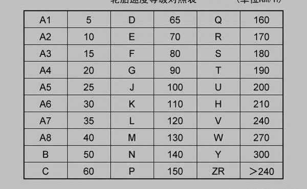 而W为车辆轮胎的速度级别,W速度级别最高为270km/h,不同速度级别对应轮胎行驶最高车速可见下图。