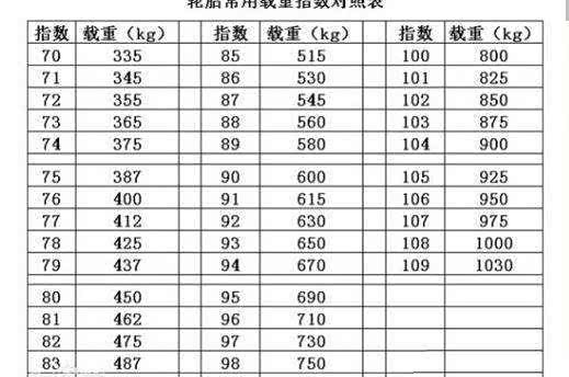 在轮胎型号后面,也会紧跟着几个数字和字母,比如225/45 R17 91W,其中91是指车辆轮胎的负荷指数,91指轮胎最大负荷为605kg,各个数字对应的负荷指数见下表所示;