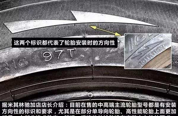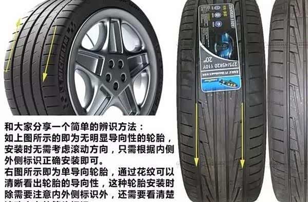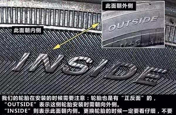 很多轮胎厂商的高端型号多采用内外不对称花纹设计,轮胎外侧更注重抓地跟耐磨,轮胎内侧更注重排水跟降噪,这类轮胎是有正反的,需要按照标识安装。还有很多单导向轮胎是有滚动方向性的,这类轮胎会有箭头标识滚动方向,如果方向装反了则会降低轮胎性能,尤其是对下雨湿地路面会导致排水槽无法排水,导致抓地力严重下降。