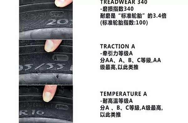 Treadwear表示轮胎耐磨程度,轮胎是否耐磨看这个指数就可以了,但是约耐磨的轮胎越硬,舒适度要略差,胎噪也会更大。Traction表示牵引力,也就是我们所说的抓地力,分为AA、A、B、C四个等级,AA为最高等级。Temperature为轮胎耐高温程度,分为A、B、C三个等级,A为最高等级。