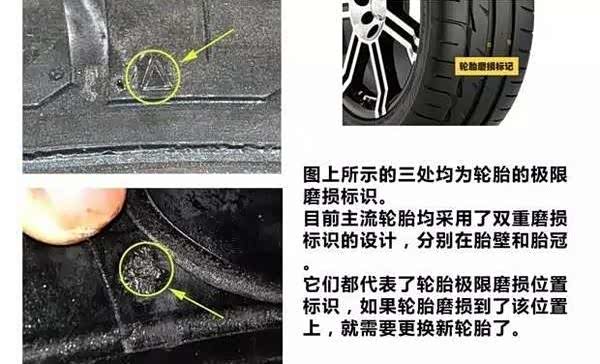 一般在轮胎胎侧会有一个三角箭头表示,与花纹槽内的凸台组成双重磨损标识,设计高度是1.6mm。它们代表的是轮胎磨损的极限位置,轮胎磨损接近磨损标识时,就需要更换轮胎。轮胎花纹的磨损,加上轮胎橡胶的老化,会使轮胎的抓地力以及排水性逐步降低,在雨雪天气等湿地抓地力会更加严重,同时轮胎橡胶老化之后,爆胎的几率也会随着轮胎的老化程度而上升。