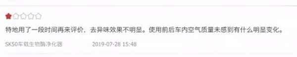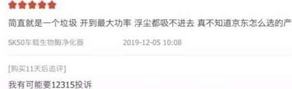 一位用户在评价中写到:"特地用了一段时间再来评价,去异味效果不明显。使用前后车内空气质量胃感到有什么明显变化。"另一位用户则是使用体验后表示:"简直就是一个垃圾,开到最大功率,浮尘都吸不进去,真不知道京东怎么选的产品",与此同时,该用户在购买11天后追评写到"我有可能要12315投诉"……
