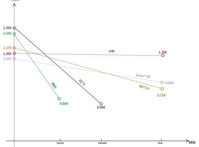 快风只花了5分钟将TVOC降到安全范围,第2名要10分多钟,其他品牌时间更长。小M则基本无变化,这或许与它的滤网有关系。