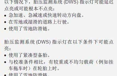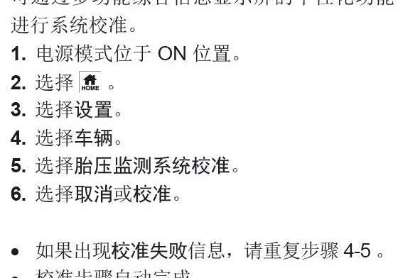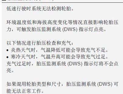 不同于直接测量每个轮胎的胎压,胎压监测系统(DWS) 对该车辆进行监测,并比较每个车轮和轮胎的滚动半径和旋转特性,在驾驶时确定一个或多个轮胎是否存在明显充气不足。这将会导致胎压监测系统(DWS) 指示灯点亮,并且多信息显示屏将会出现信息提示。■ 胎压报警系统校准每次执行以下操作后,必须进行胎压监测系统(DWS) 校准: 调整一个或多个轮胎胎压。 轮胎换位。 更换一个或多个轮胎。校准胎压监测系统(DWS) 前: 对4 个轮胎设置冷胎压力。确认: 确保车辆完全停止。 档位位于p 位置。 电源模式设置为 ON。