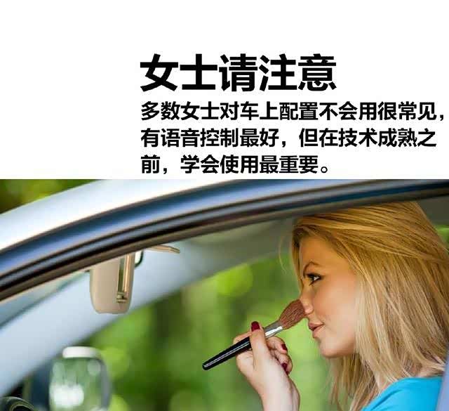 还有,性别的不同,对配置的需求也有很大差别。我们发现,女士们普遍对汽车的理解稍差,开车1、2年不知道怎么开远灯、除雾、后雨刮等很常见,更别说手机映射、换备胎等,所以如果是女士用车,什么自动大灯、自动雨量感应雨刮、倒车影像等,预算允许的话,最好一应俱全,对于缺少安全感的女士,行车落锁、后视镜加热也显得极为重要。