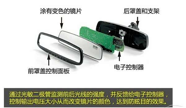 自动防眩目后视镜的主要核心原件包括一前一后两个光敏二极管、一面可以变色的反光镜以及电子控制器。电子控制器根据两个光敏二极管吸收的光线强弱差值改变输出电压:当后方光线强于前方光线时,电子控制器输出电压则会升高,令电液颜色变深,反光镜显示暗光,并减弱后方光线照射强度,从而起到防眩目的作用。