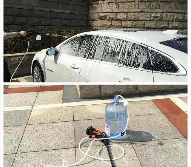 由于南方最近一直下雨,洗车机一直没有用武之地。难得出了一天太阳,赶紧拿出洗车机用用,过程着实仓促。此次挑战用一桶水来洗一辆车,找了单位的15.5L纯净水桶,灌了三分之二的自来水。首先将洗车精灌入洗车精壶,接上洗车机,第一次使用,由于水管空的所以出水较慢,等上水后就可以出泡沫了,一包洗车精可以充分覆盖一辆车,等到喷出的是清水,就可以进行下一步了。