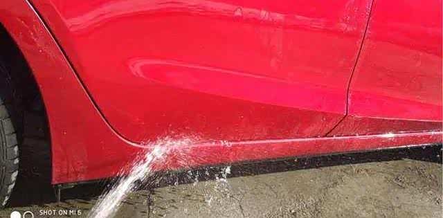接着我们用水龙头冲洗车身,最重要的是冲掉沟沟槽槽里面的杂物,一方面利于玻璃升降,另一方面也省得自己用毛巾细扣了。