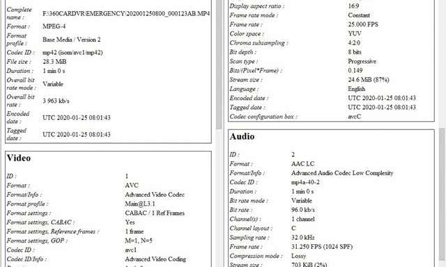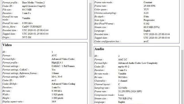 前摄像头录制的视频参数情况,视频尺寸是1920*1080,标准的16:9,帧率则是25fps,音频格式AAC/LC。