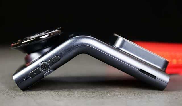 像极了是一块长条形的金属条强行掰弯的效果,外观采用的深灰色类金属设计,第一眼以为是金属外壳,实际应该是塑料材质,不过做工真能以假乱真了。在左侧面有一个外放扬声器槽,还有设计了三枚按键,分别是菜单键,确认键,返回键