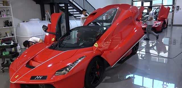 而除了兰博基尼AVENTADOR SV,这3台跑车的性能似乎更加强悍一些。当天这家洗车店还来了世界神车之一的法拉利拉法,而且一来就是2台。法拉利拉法相信不少车迷朋友应该都知道,该车跟保时捷918以及迈凯伦P1并称为世界三大神车。