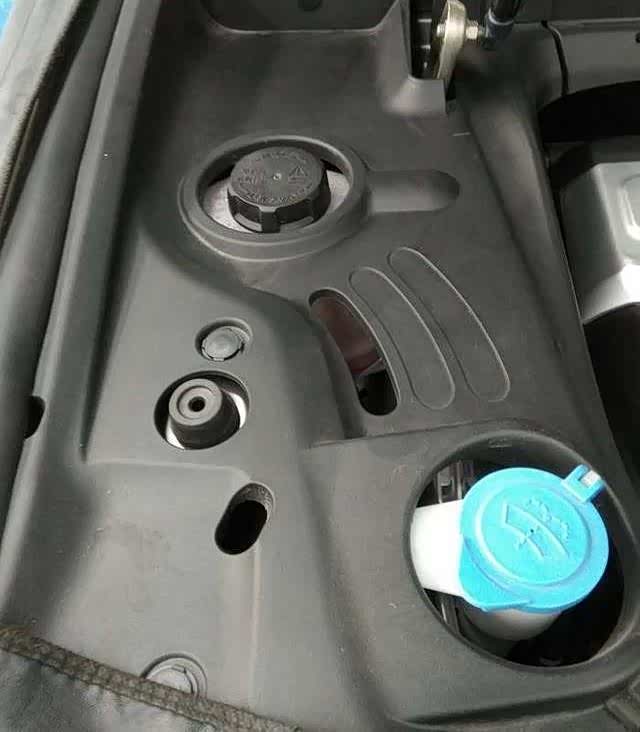 吹好清理干净后按原路装回去,接下来到防冻液了发动机仓左边,圆罐状的就是冷却液,里面是红色的,有点偏少,打开盖子补充了点,如图,从WIFI标记空口处往下看可以看到有液位标注,有最高和最低限位哦,加到上限最好。旁边蓝色的看盖子图标肯定都知道是什么,也是经常用的,当然是玻璃水了。这个就自己换了。