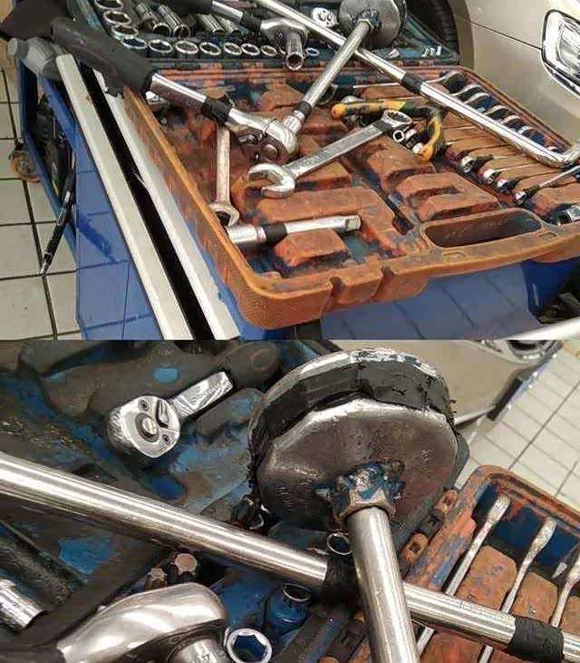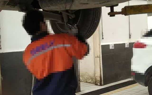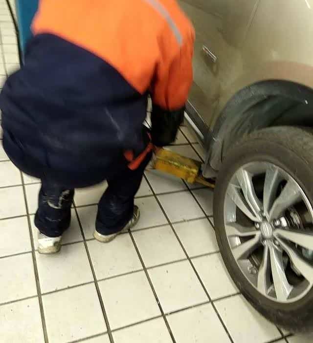 继续等待放油,放彻底干净点,间隙小伙子开始检查胎压,逐个加气,这里找师傅吹了下,冬天加压到2.5,夏天加压到2.4,学习了。轮胎气压检查了后,检查轮胎胎面胎壁,又用起子把轮胎面卡的小石子全部撬掉,很认真。