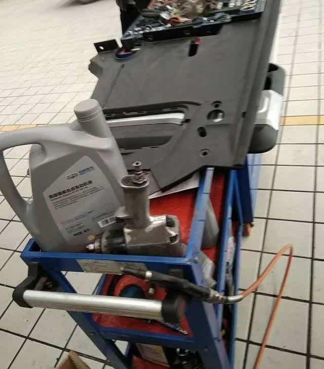 各种工具一堆,很齐全专用用具出场底盘全部检查完后,检查刹车,这时机油已经彻底放干净了,把放油螺钉装还原,接下来就是换机油滤芯了。