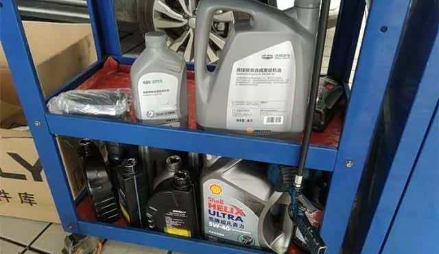 几分钟后,机油,滤芯拿来了来个偷拍特写,下面的是用过的其他人的我们的博越加机油要4L多点,所以有一大一小两瓶。