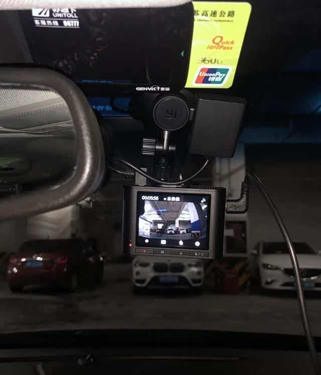 这张照片是主机安装后的开机展示,首先是回应了上一章节中提到的关于主机及GPS数据块(就是之前提到的方块块,姑且这样称呼)的安装效果,两个装备一体安装在一个吸盘上,然后整体隐藏安装在前挡风玻璃后视镜位置。这里可能有人会问,不是说好的数据线隐藏在车体内的嘛?这里怎么下垂下来了?这张还是安装过程的一个环节,仅仅是主机安装完成了,按照完整过程这张是在上一张之前拍摄的,但是为了说明记录仪的视频效果就后置展示了,故这里说明的重点除了安装后外观效果,还是更着重说明一下小蚁行车记录仪拍摄和视频显示的效果!为了体现恶劣环境下的效果,直接跳过了白天或光照条件充足下的效果显示,这张是地下车库静止状态时的拍摄和显示情况,目前国内车库的光线是普遍昏暗,随着私家车保有量不断增加,车库事故也是逐年增加,车库内的使用效果也具有代表性咯!从照片效果来看,图像效果清晰,从个人感官来说是符合介绍中宣传的“高品质6玻镜头”,且拍摄后对画面进行了补光处理,原本车库昏暗环境变得更加清晰,车辆及其他障碍物更加容易辨认!