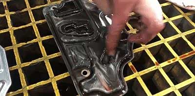 检查完后就是简单地清洗和更换维修包配件,先用化清将油底壳清理干净,完成后安装新的阀体集滤器,安装上新油底壳密封胶条就可以进行换油作业了。