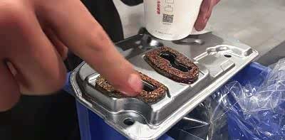 接下来就是拆油底壳清洗和更换集滤器,基本上变速箱最脏的一面都可以展现在眼前。变速箱阀体的集滤器,基本已经被研磨下来的金属粉末覆盖成了黑色,油底壳一样也是厚厚的一层油泥和金属粉末混合物。