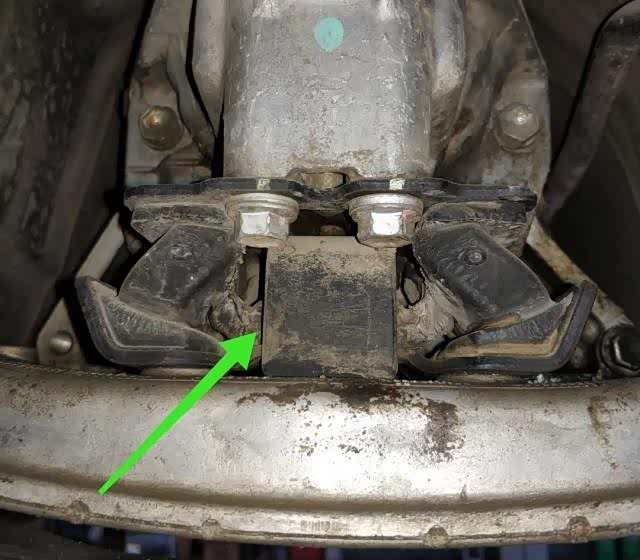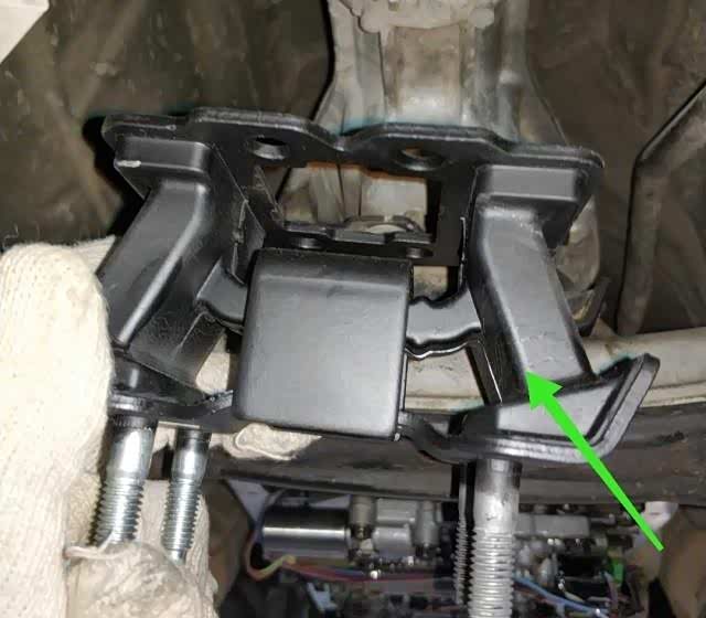 下图所示,这是位于变速箱后部的机脚,它起到支撑并减轻变速箱震动的作用。箭头所示,可以看出机脚的变形比较严重,变速箱的下部已经与机脚的中间位置接触,在加减档位时,不能起到很好的减震作用。