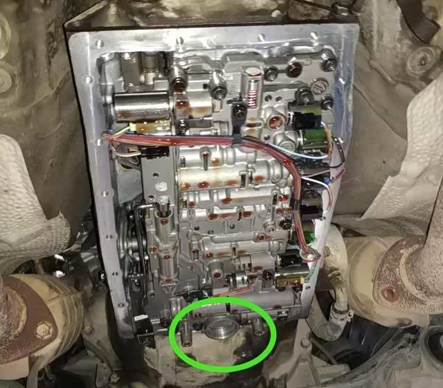 下图绿色区域所示,这个小孔就是变速箱油进入变速箱内部循环的位置,滤清器已经被拆下。