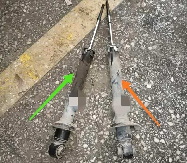 由于新变速箱油滤清器没有回来,师傅就决定先拆卸两条后减震器。下图所示,这就是师傅拆下来的减震器,减震弹簧已经被取下来。我们知道,减震器的更换都是一对一对更换,不然的话,新旧减震器的阻尼不一样,会加速减震器的损坏速度,所以右边不漏油的减震器也需要一起更换。