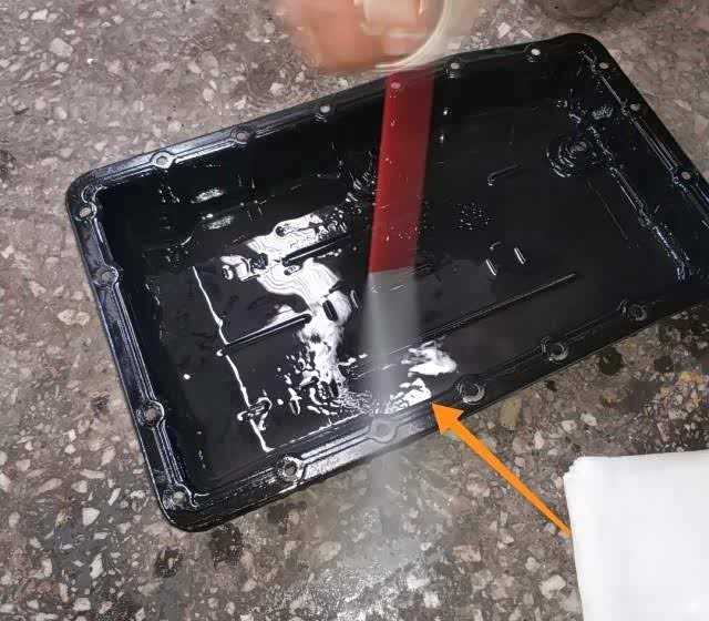 并且,变速箱油底壳上面还有很多杂质,需要用清洗剂才能清洗干净。下图所示,师傅正在用清洗剂清洗油底壳上的杂质。