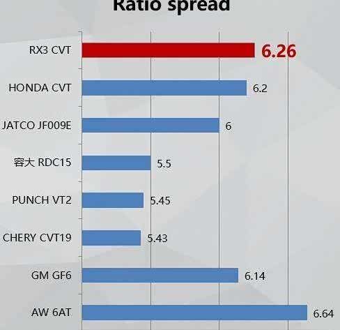 而CVT变速器则可以使发动机处于一个特定的转速,实现不同的车速要求。而这个特定的转速,往往就是发动机的最佳工况转速,可以是动力,可以是油耗。这样下来,发动机与CVT变速器之间的配合,总体效率要比搭配AT或者双离合变速器的效率高,从而保证了经济性,这也是目前市面上日系车普片采用CVT变速箱的原因。RX3所搭载的爱信CVT变速器,其速宽比高达6.26,比市面上绝大多数同类型变速器高,因此在经济性上有更好的表现。
