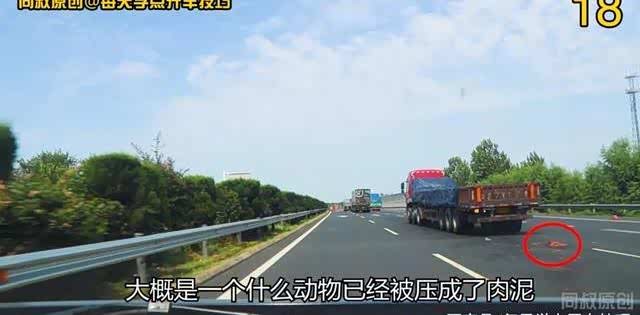 就在大货车刚刚经过的地面上,大概是一个什么动物已经被压成了肉泥。
